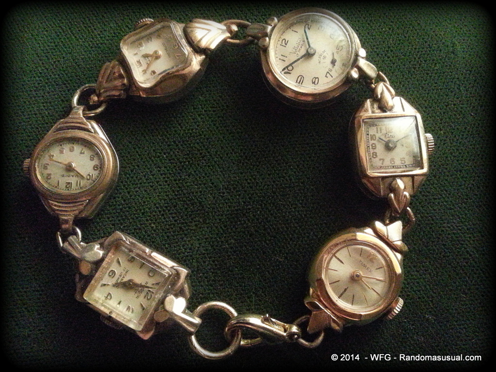 I usually dismantle non functioning watches and use the parts in other projects, but these six seemed to go together so well that I made a bracelet out of them.