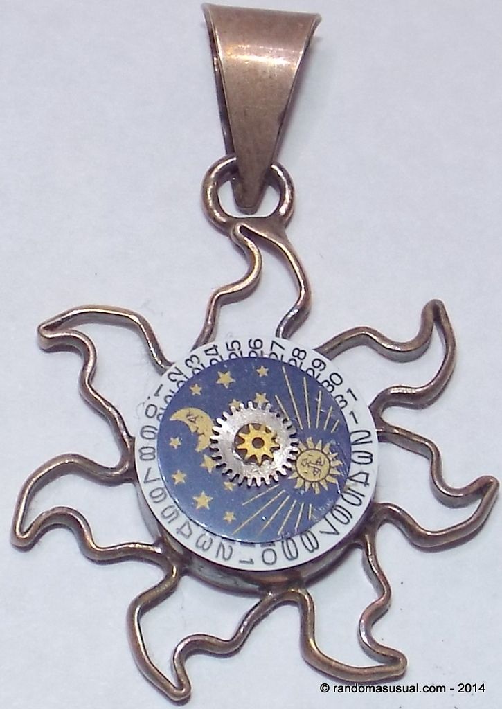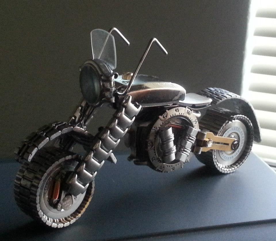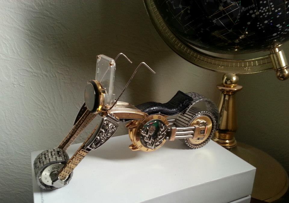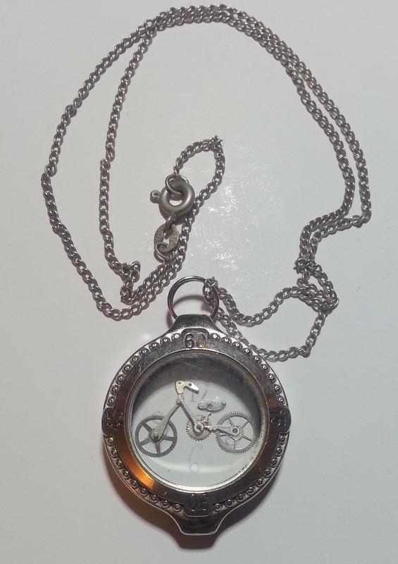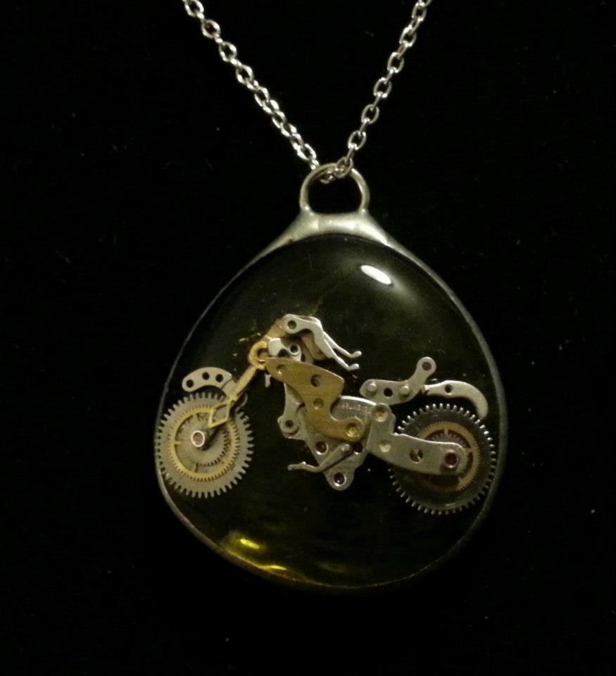 Motorcycle pendant made out of watch parts mounted on a medallion. About 1.5″ in diameter.