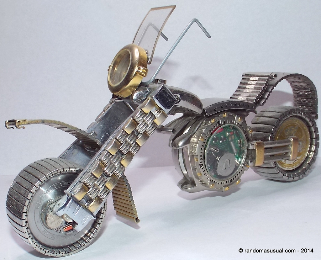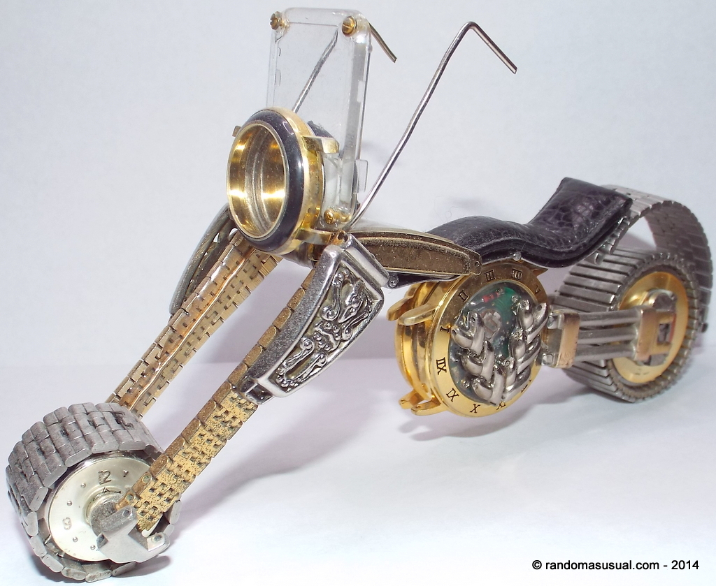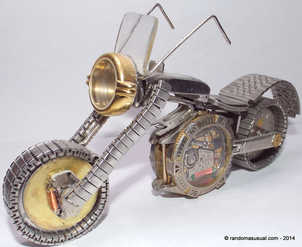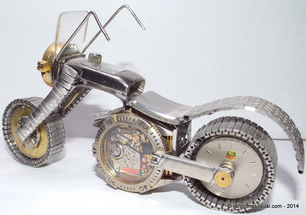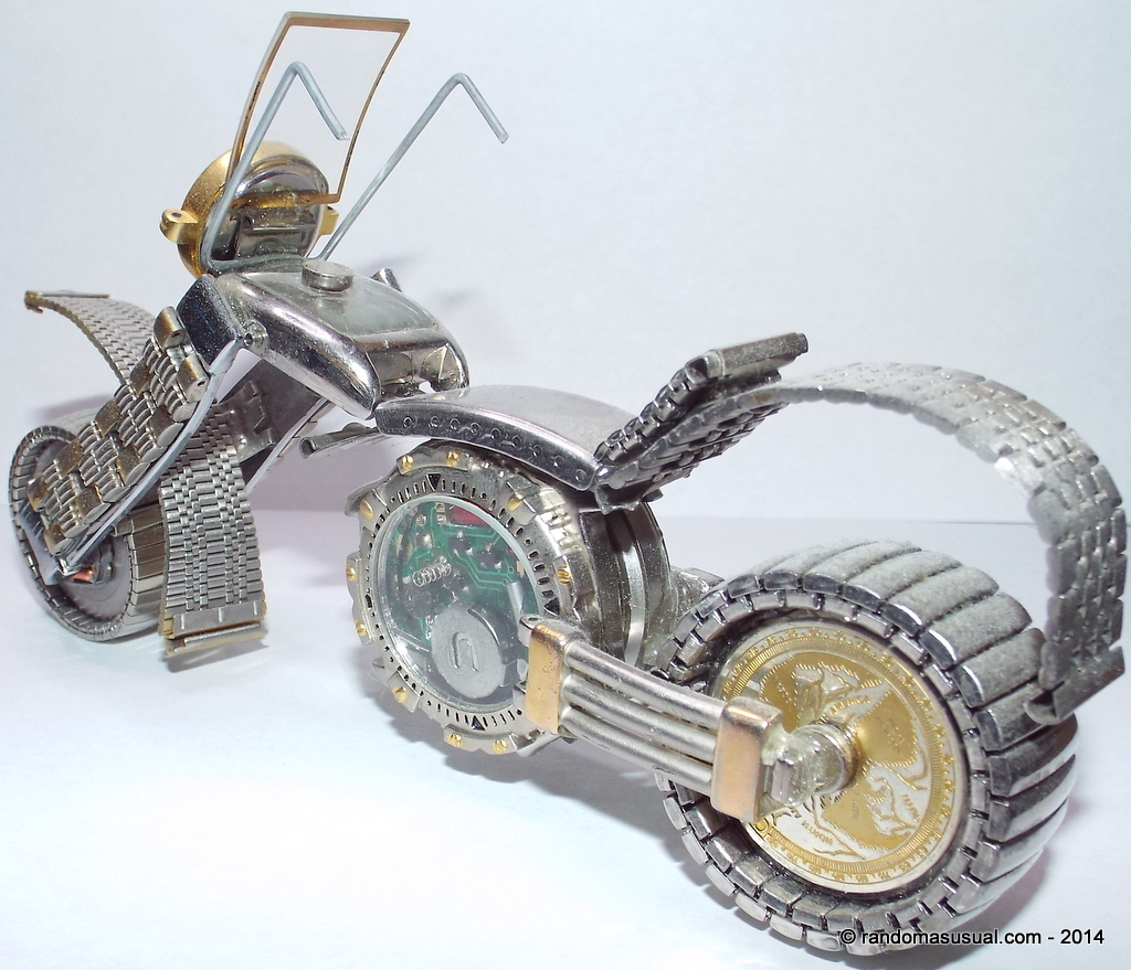 Motorcycle pendant made out of watch parts mounted on a medallion. About 1.5″ in diameter.