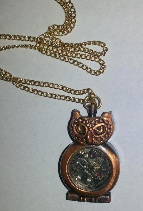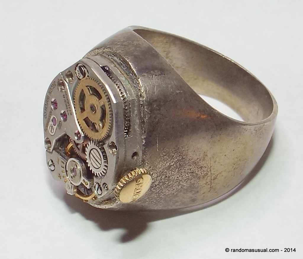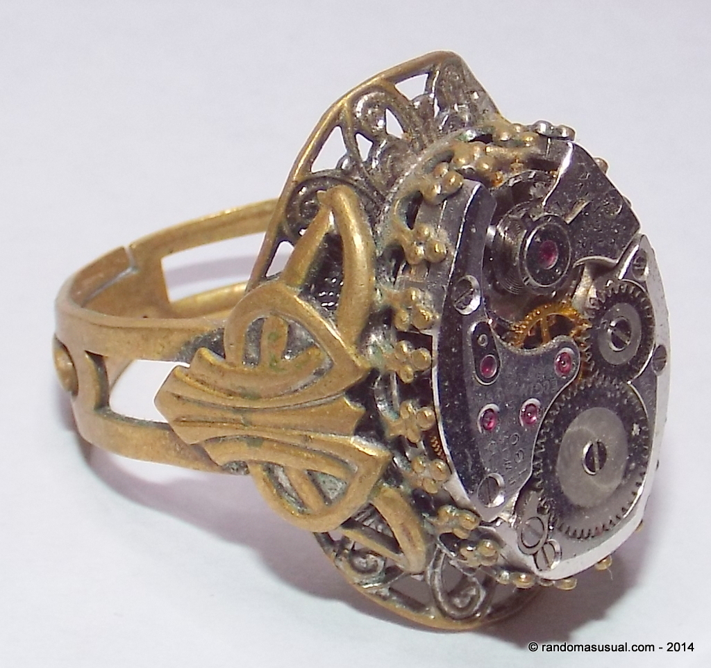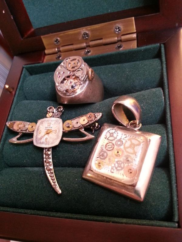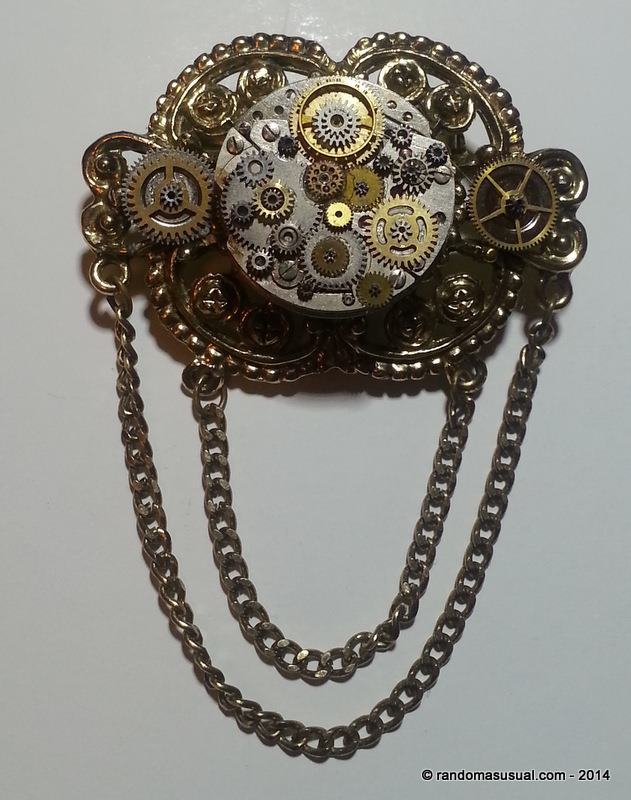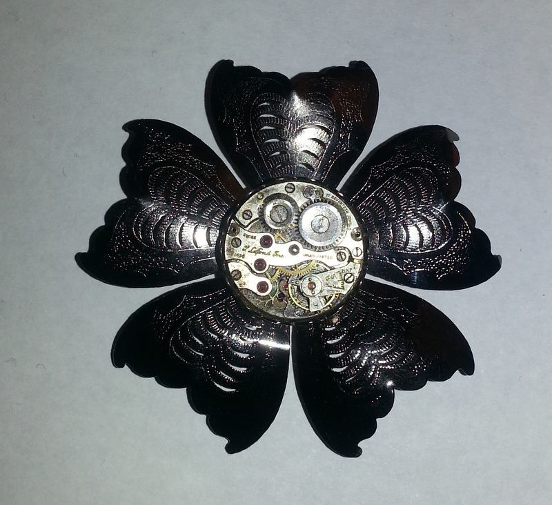 An upcycled brooch. The center stone was lost so I replaced it with a watch movement.