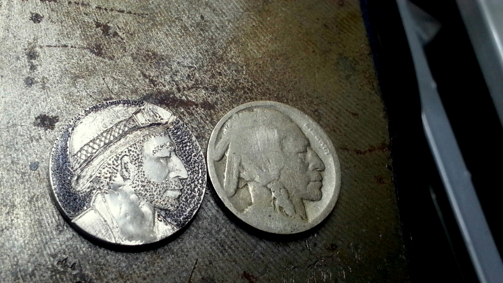 My first attempt at a Hobo Nickel. He’s a miner now. A little more explanation in the photo below.