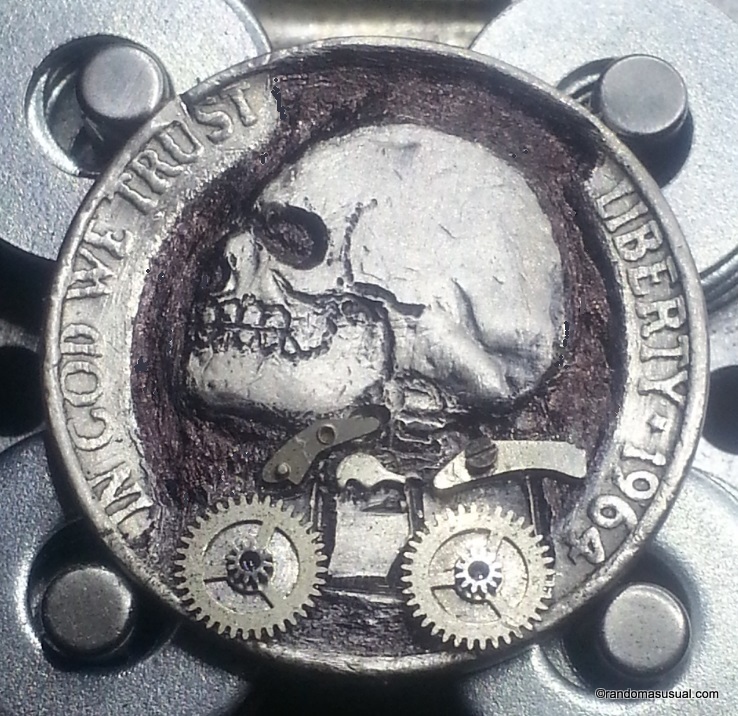 Tried a bit more coin carving. This is Cog Coin #2. 1964 U.S. nickel and my first skull. It’s called: Cruisin’